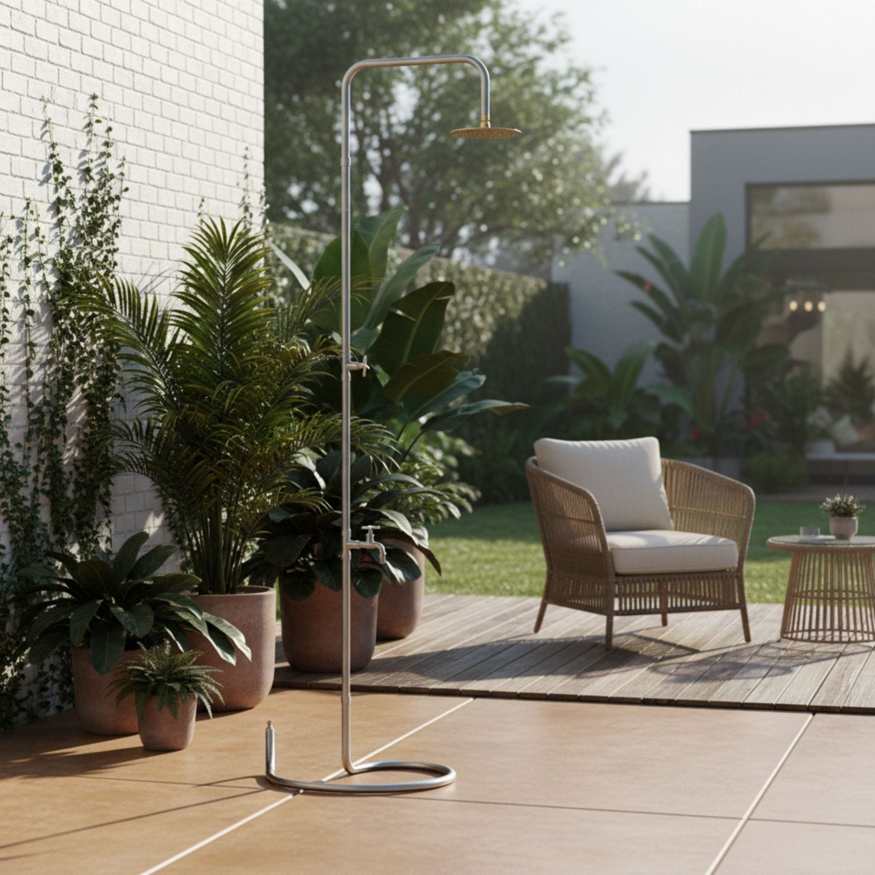 - Design meets function: High-quality outdoor shower made of brushed stainless steel – weatherproof and shapely