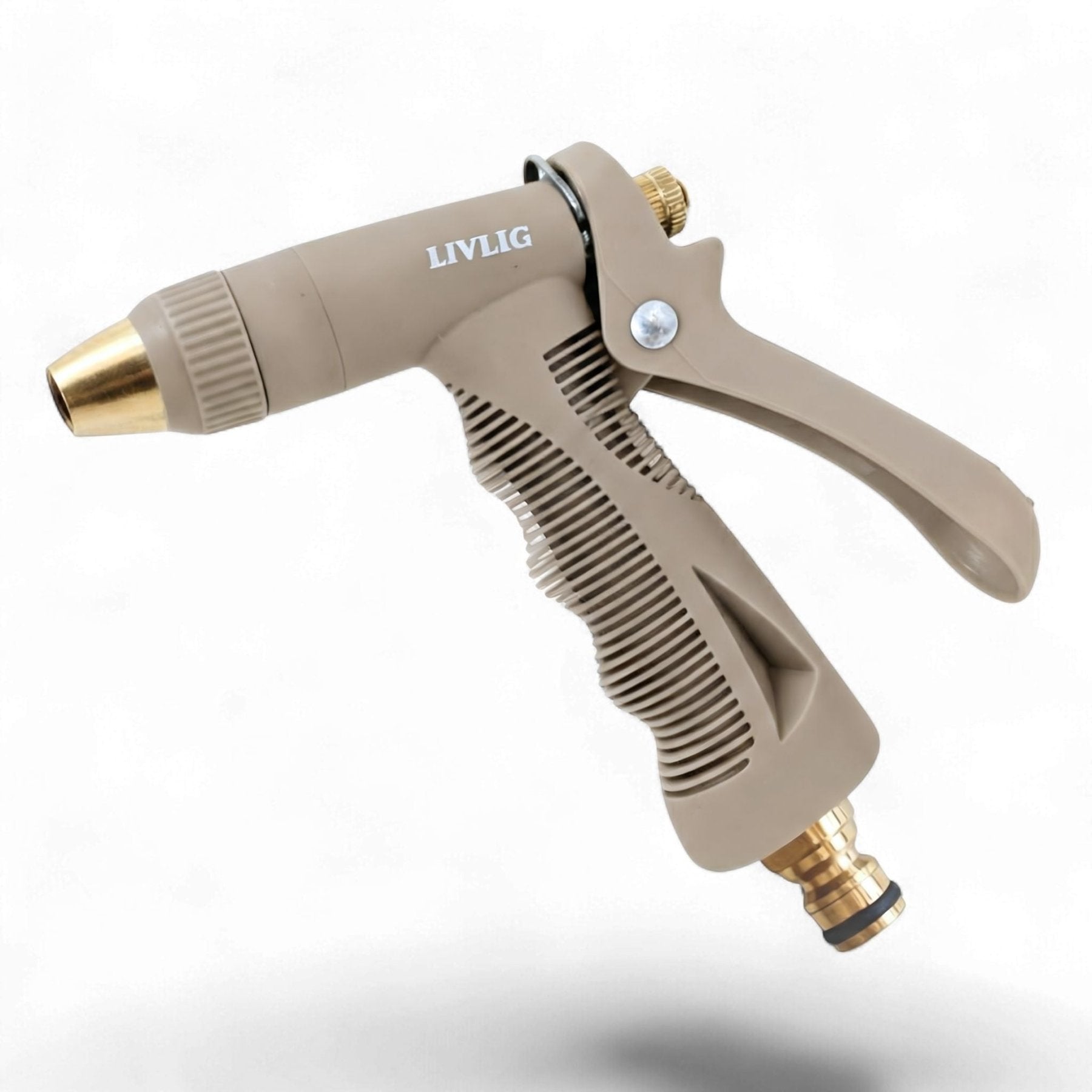 Beige Gartenspritze Kunststoff von LIVLIG mit geriffeltem Griff und goldenen Akzenten.