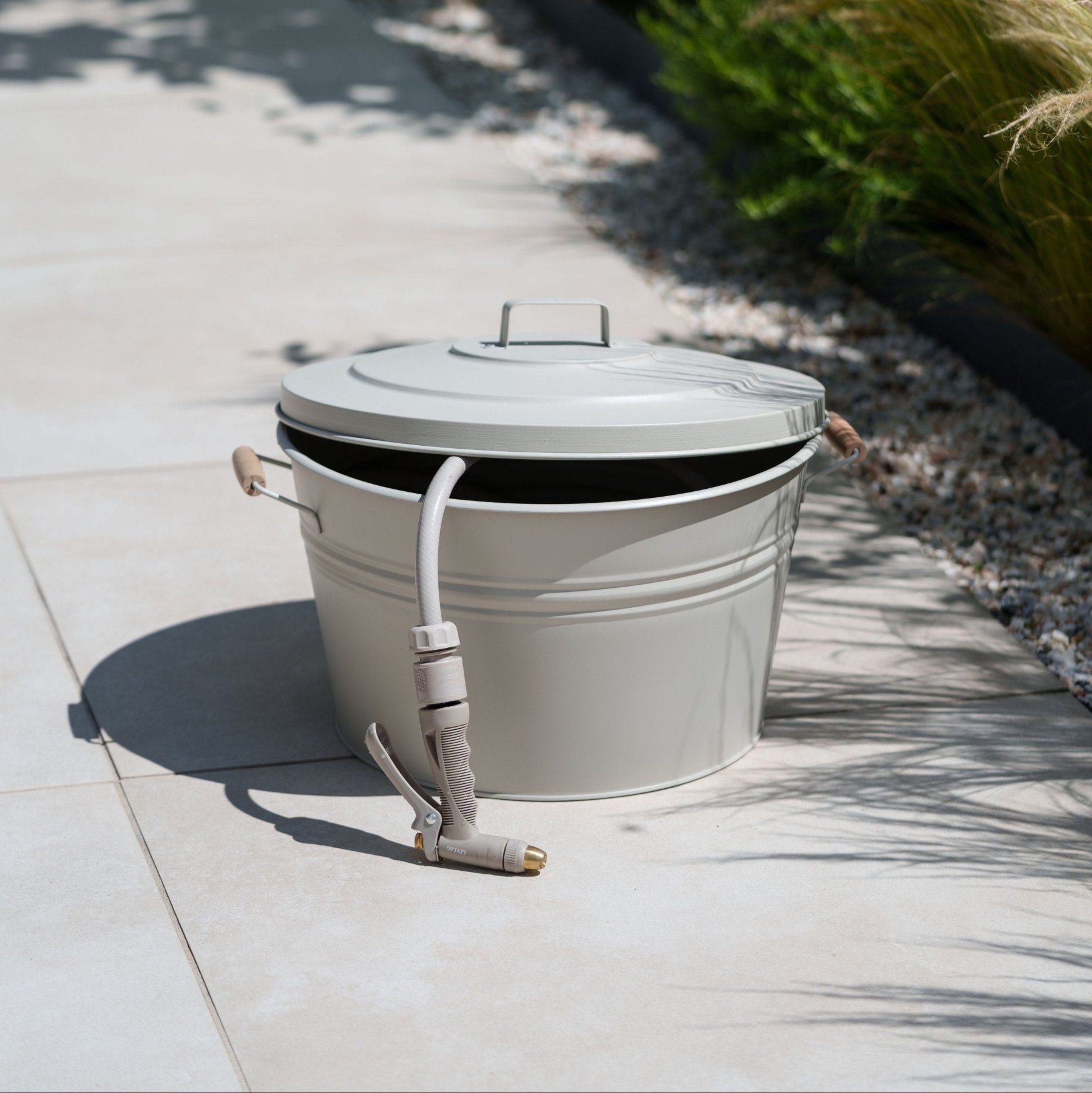 Grauer Schlauchtopf Metall von LIVLIG mit Holzgriff und Gartenschlauch im Inneren, mit Deckel.
