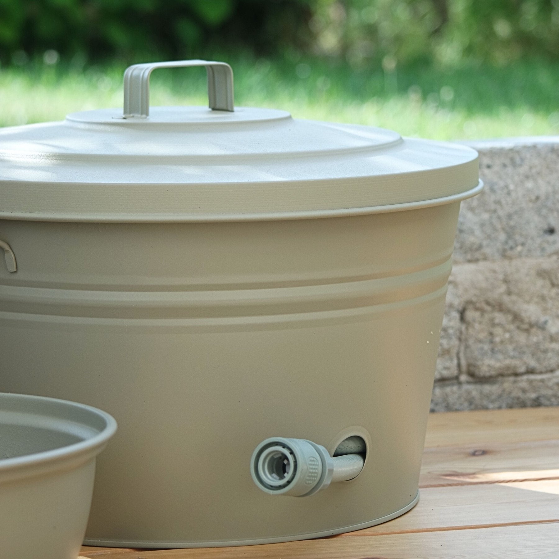 Metall Schlauchtopf von LIVLIG, im Freien auf einer Holzterrasse stehend, mit Anschlussstück und Deckel.