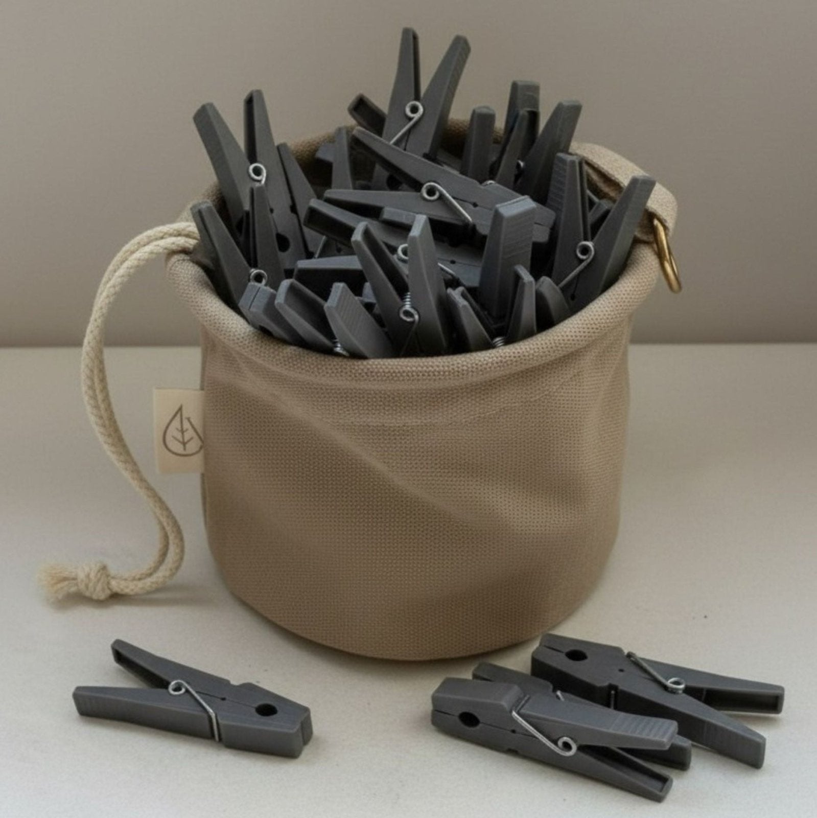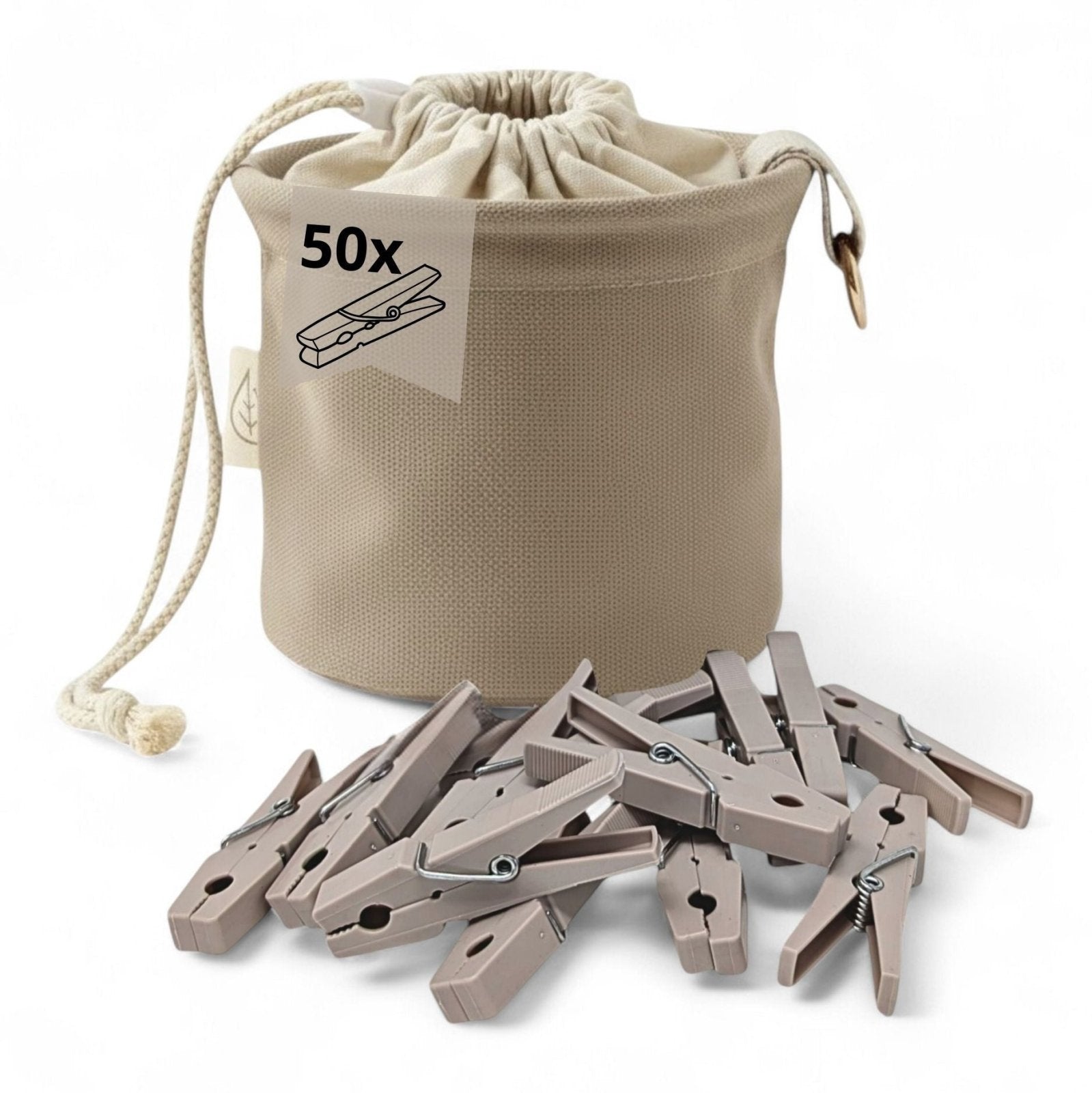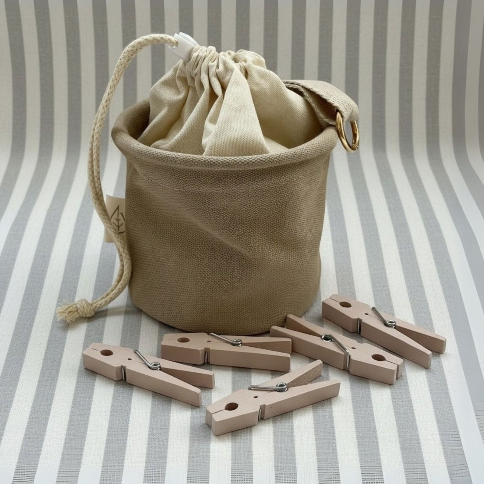 Beiger Wäscheklammerbeutel mit grauen Wäscheklammern von LIVLIG, mit Kordelzug und Label mit Blatt-Symbol.
