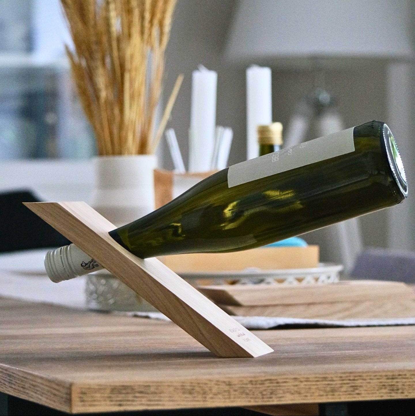 Il portabottiglie è realizzato al 100% in legno di quercia europeo ed è decorato con una incisione personalizzata. Fa sembrare ogni bottiglia di vino sospesa in modo magico e la mette abilmente in risalto. Insieme all'adesivo per bottiglia coordinato si crea così un fantastico set regalo per vino, ideale come dono per varie occasioni, che valorizza ogni bottiglia rendendola un punto focale.